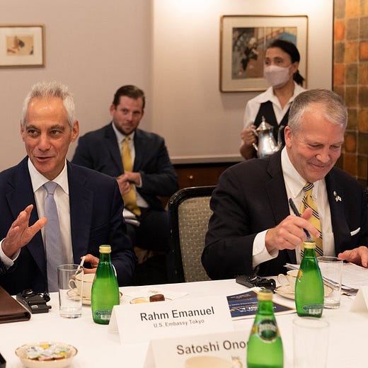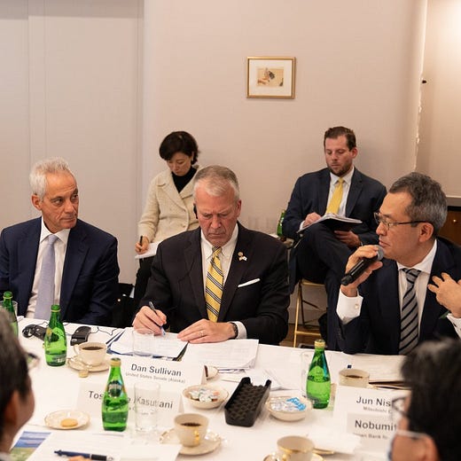 Senator Dan Sullivan and Ambassador Rahm Emanuel collaborate on energy policy in Tokyo